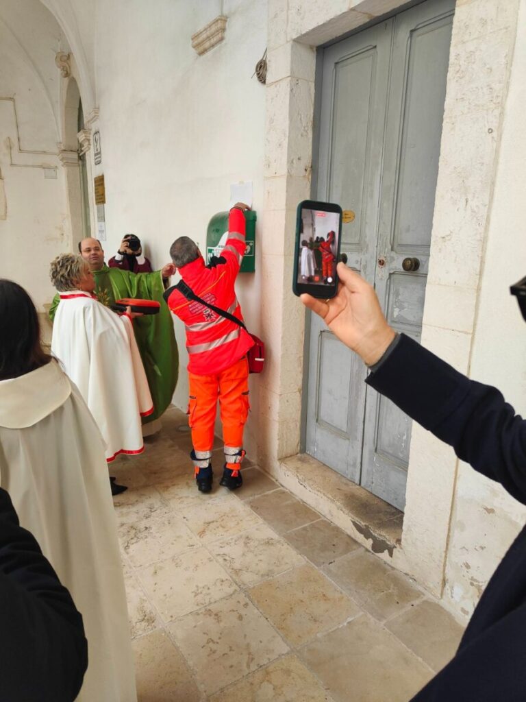 Al termine della Celebrazione, il Parroco ha benedetto il defibrillatore semiautomatico e un Cavaliere Volontario di Protezione Civile della Nova Militia Christi ha poi fissato il DAE nel Chiostro della Chiesa, adiacente all’entrata della Scuola dell’Infanzia.